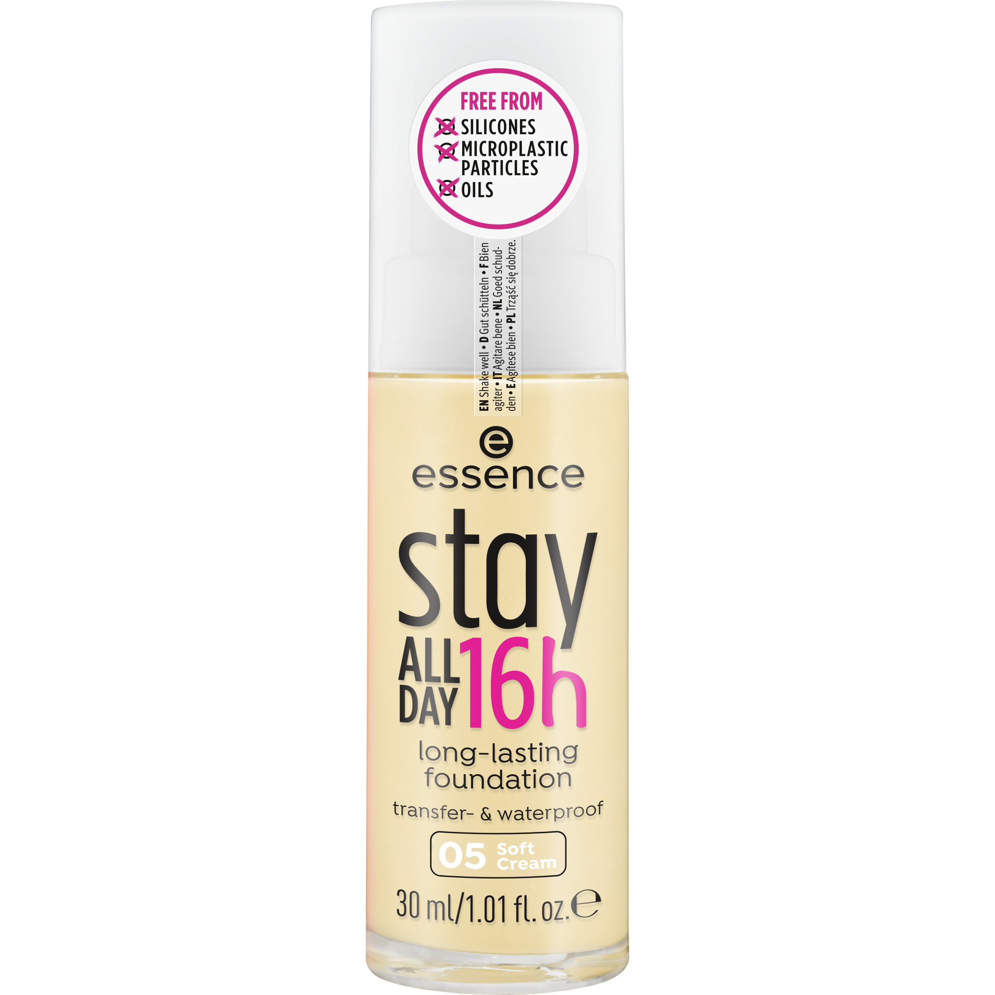 De formule van de STAY ALL DAY 16H FOUNDATION is vrij van siliconen, parabenen, microplastic deeltjes, alcohol, parfum en olie. De foundation in een kwalitatief glazen flesje heeft een superzachte textuur, geeft de teint een gelijkmatige, egale uitstraling tot wel 16 uur lang en biedt een gemiddelde tot hoge dekking. Het is ook water-, masker- en vlekproof.