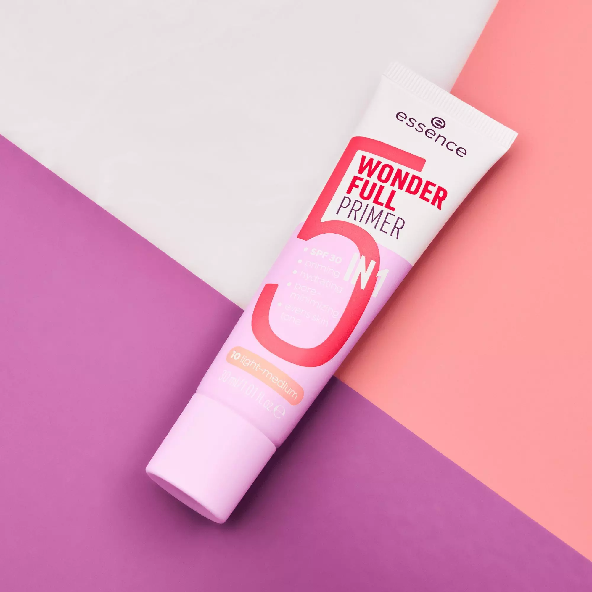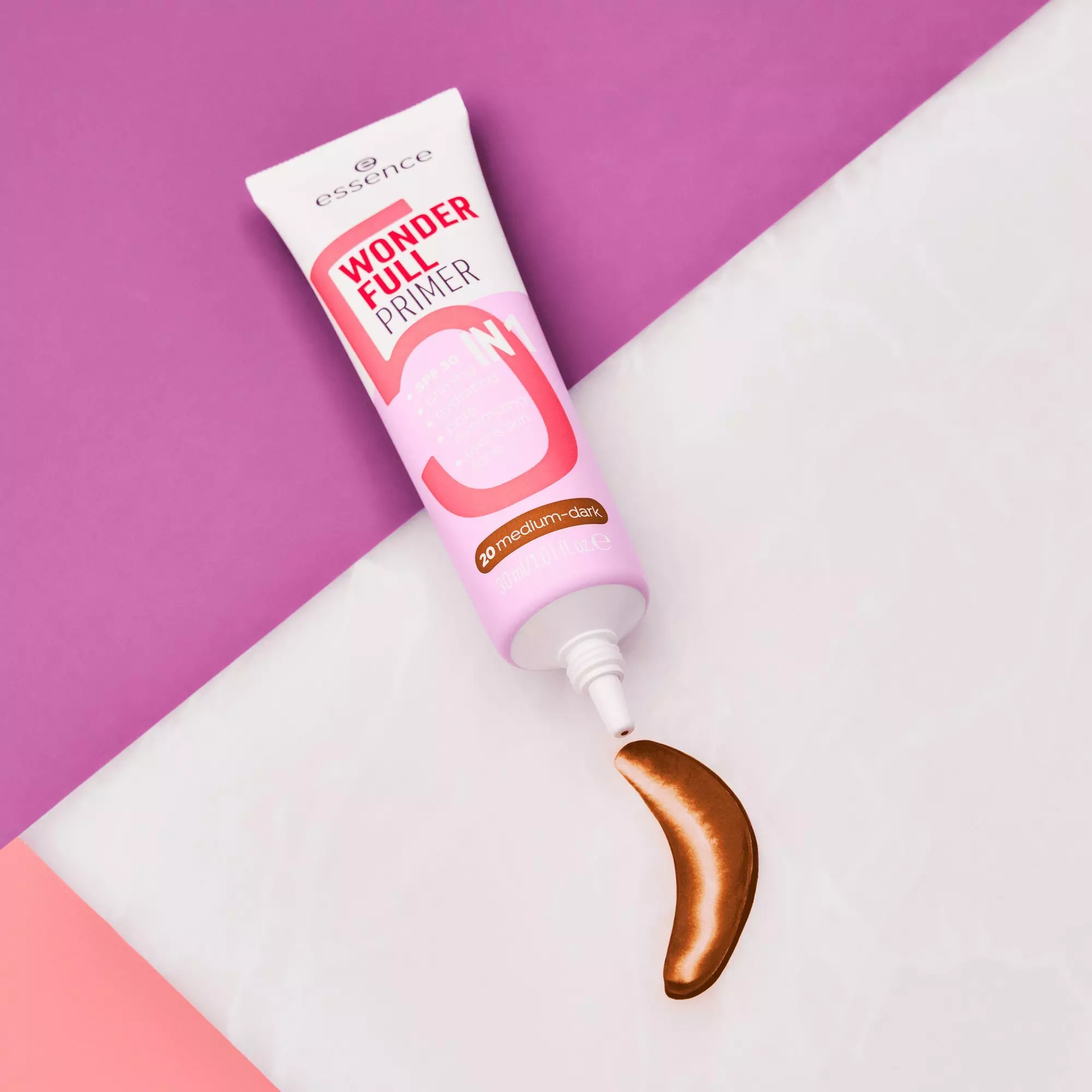 Bereid je gezicht voor op je favoriete make-up look met de essence WONDER FULL PRIMER 5 IN 1 20 medium-donker De primer is verkrijgbaar in een transparante bruine tint en is ideaal voor medium tot donkere huidtinten. De primer geeft je huid ook een gezonde uitstraling en heeft SPF 30 om haar te beschermen. De gladde textuur helpt imperfecties te verminderen en geeft je gezicht een matte airbrush-look. Alle poriën en fijne lijntjes lijken te verdwijnen, waardoor je de perfecte basis hebt voor elke make-up look.